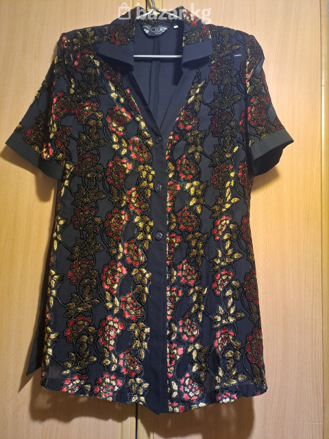 Элегантная женская блузка из шифона с набивным узором из бархата и люрекса. Спереди застежка на пуговицы. Можно носить с брюками и сверху топа.