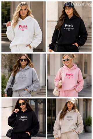 Женский костюм-худи “Paris” с широкими брюками Описание: - Двухпредметный комплект: худи с капюшоном + свободные брюки. - Принт “Paris” на груди, контрастная вышивка/надпись. - Посадка расслабленная, брюки прямые, широкие, с эластичным поясом и карманами. - Худи с регулировочным шнурком, манжеты и низ на мягкой резинке. - Ткань плотная, мягкая, с начёсом внутри — комфорт в прохладную погоду. - Подходит для повседневной носки, прогулок, путешествий и домашнего отдыха. - Цвета на выбор: белый, чёрный, серый меланж, пудрово-розовый, бежевый. - Легко сочетается с кроссовками, пальто/плащом и городской сумкой. Размеры: - Свободный крой, рассчитан на комфортную посадку и свободу движений. Уход: - Машинная стирка в деликатном режиме при низкой температуре. - Стирать и гладить, вывернув наизнанку, чтобы сохранить принт.