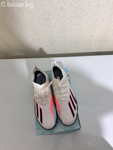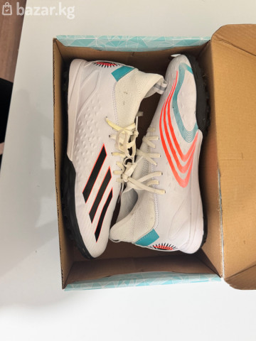 Тип: сороконожки для мини-футбола/футзала на искусственной траве (TF), резиновая подошва с шипами. - Верх: синтетический материал с текстурированными зонами для лучшего контроля мяча. - Посадка: полувысокий эластичный бортик-носок и шнуровка для плотной фиксации стопы. - Цвет: белый с черными и неоново‑коралловыми элементами, вставки бирюзового цвета. - Амортизация: промежуточная подошва с демпфированием для снижения ударной нагрузки. - Подошва: износостойкая, с разнонаправленными мелкими шипами для сцепления на ИИ-покрытиях и резиновых кортам. - Детали: усиленный носок и пятка, вентиляционные зоны по бокам, петля для удобства надевания. - Комплектация: коробка с маркировкой “10”. Подходят для тренировок и игр на искусственном газоне, резиновой крошке и твердых покрытиях; обеспечивают контроль,
