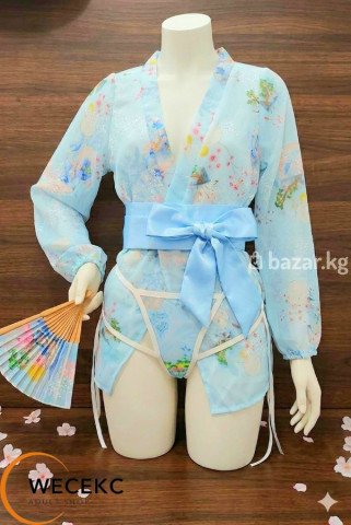 Нежность в каждом движении 💙 Лёгкий халат в стиле кимоно из полупрозрачной ткани мягко струится по телу, подчёркивая силуэт. Воздушный голубой оттенок с деликатным цветочным принтом создаёт романтичное настроение, а пояс красиво акцентирует талию. Идеально для уютных вечеров и особых моментов ✨