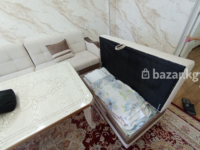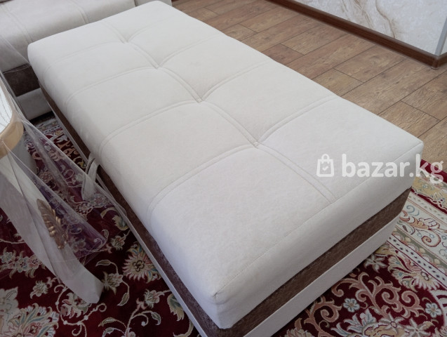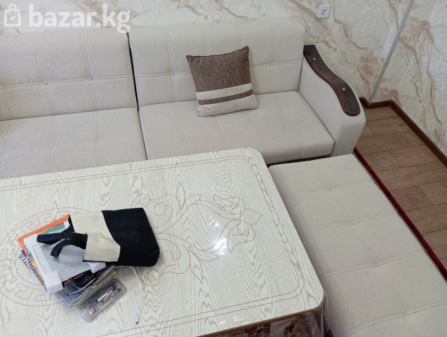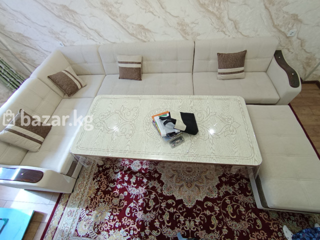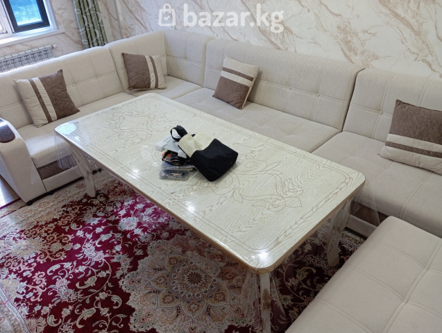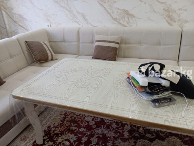Угловой комплект для гостиной/столовой: большой диван с пуфом и обеденным столом. В комплект входит: - угловой диван, выдвижная часть; - пуф/банкетка; - крупный стол со столешницей с орнаментом; - четыре подушки. В отличном состоянии, осмотр в любое время. Местожительство город Базар-Коргон!