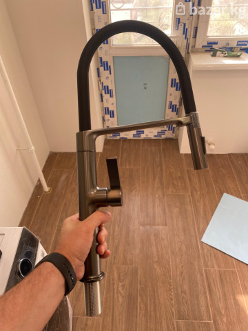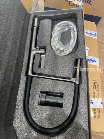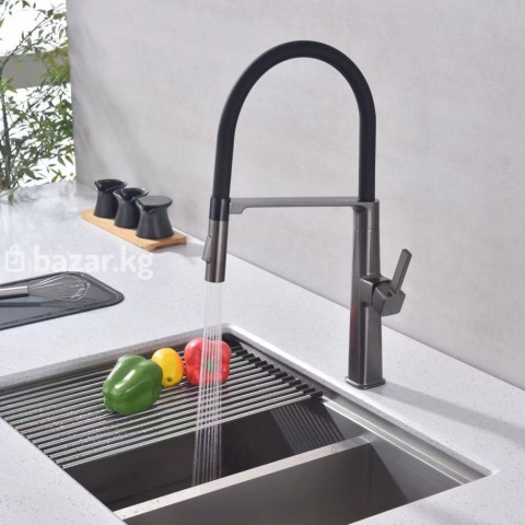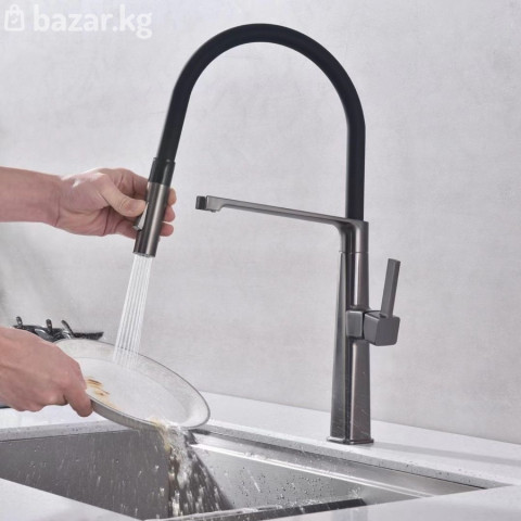 - Дизайн: высокий П-образный дуговой шланг в матовом черном, корпус из нержавеющей стали/металла графитового оттенка. Современная геометрия с прямым поворотным носиком. - Управление: однорычажное — точная регулировка температуры и напора. - Выдвижная лейка: увеличенный радиус действия для мытья посуды, овощей и самой мойки. - Режимы струи: переключение кнопкой на лейке — аэрированная струя и душ (видно на фото). - Поворотный носик: удобно направлять поток в разные зоны мойки, подходит для двухсекционных раковин. - Быстрый возврат лейки в держатель, аккуратная фиксация. - Антискользящее покрытие гибкого шланга, устойчивость к загрязнениям и потемнению. - Совместимость со стандартным отверстием в столешнице/мойке. - Подходит для бытовых и полупрофессиональных кухонь: ополаскивание продуктов, интенсивное смывание остатков, наполнение высоких кастрюль. Комплектация на фото: смеситель с гибким шлангом и выдвижной лейкой,