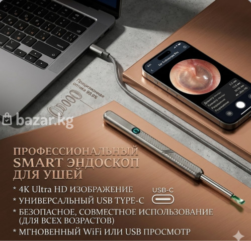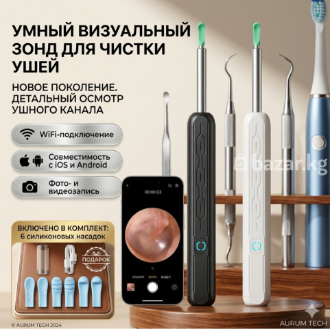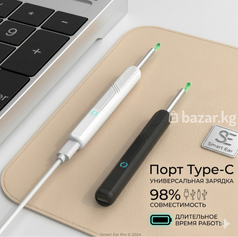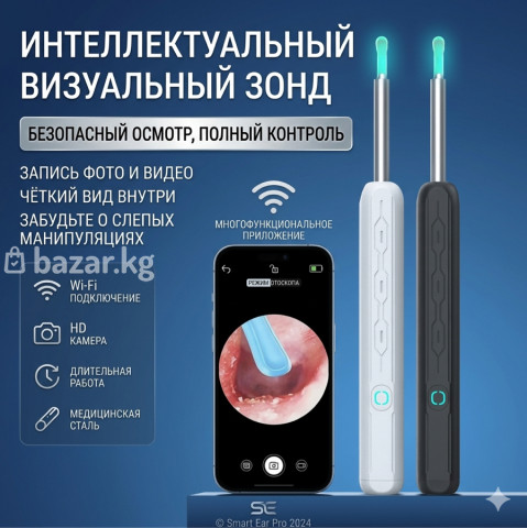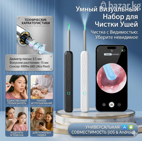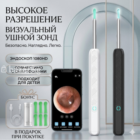 Умный визуальный ушной зонд/эндоскоп Smart Ear - HD изображение, прецизионная оптика 99,8%: четкий контроль процесса осмотра и чистки. - Камера HD Ultra Pixel, диаметр линзы 3,5 мм, фокусное расстояние ~15 мм — подходит для узких слуховых каналов; есть насадка 3,0 мм (идеально для детей). - Пищевая нержавеющая сталь SUS304, безопасные мягкие наконечники. - Подсветка и стабилизация температуры для комфортного использования. - Wi‑Fi подключение к смартфонам и мгновенный просмотр; универсальная совместимость iOS и Android. - Подключение и просмотр также возможны по USB Type‑C (универсальный порт). - Приложение: осмотр, внутренний вид, фиксация фото/видео, чистка. - Длительное время работы, быстрая зарядка через Type‑C; совместимость с 98% кабелей/зарядных устройств. - Подходит для всех возрастов: единоличное и парное использование, родитель и ребенок, пожилые люди. - Эргономичный корпус, антискользящее покрытие, световая индикация. - Варианты цвета: черный и белый. В комплекте: эндоскоп с камерой, сменные мягкие насадки/ложечки, кабель Type‑C,