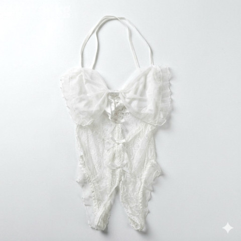 Нежный белый комплект с большим объёмным бантом из полупрозрачной ткани и тонкого кружева. Халтер-шея с тонкими завязками, изящный кружевной лиф с декоративными бантиками и воздушные рюши создают невероятно романтичный и женственный образ. Лёгкая полупрозрачность и мягкие складки добавляют лёгкости и соблазнительности. Идеальный выбор для тех, кто любит утончённую нежность и хочет почувствовать себя настоящей принцессой в особенный вечер.
