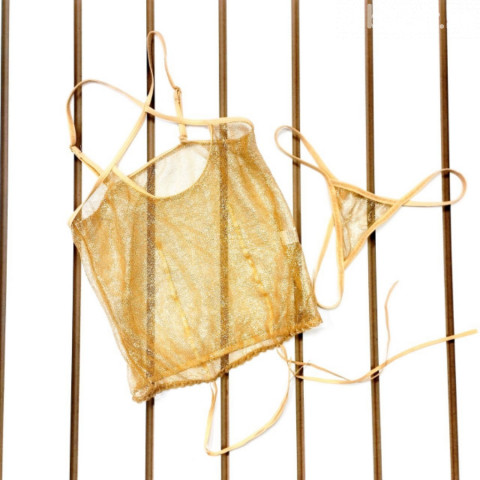 Золотое сияние и легкость Заголовок: Ослепительный золотой блеск Легкий, дерзкий и по-настоящему солнечный комплект для тех, кто не боится сиять. Это белье создано для смелых образов и игривого настроения. Топ: Невесомая сетка с золотистым напылением мягко ложится по фигуре. Тонкие бретели-завязки позволяют регулировать посадку и добавляют образу хрупкости. Трусики: Минималистичный дизайн в стиле стрингов подчеркивает открытость и свободу движений.