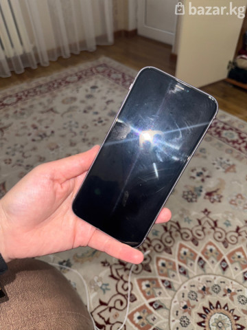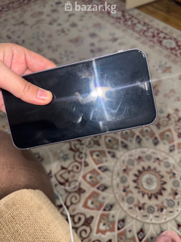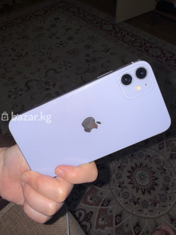 Смартфон Apple iPhone 11 в лавандовом цвете. Устройство оснащено двойной камерой, расположенной в квадратном модуле на задней панели. На задней части корпуса также присутствует узнаваемый логотип Apple. Телефон имеет плоские грани и закругленные углы, что придает ему современный вид. Экран покрыт защитным стеклом, на котором видны следы использования.