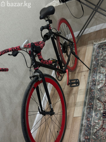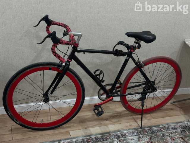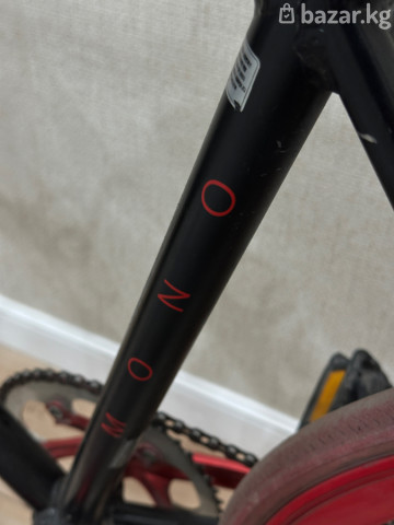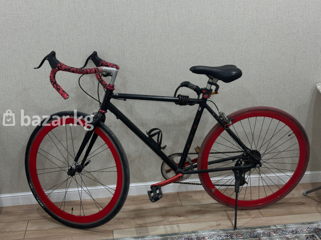 Городской шоссейный (скоростной) велосипед MONO (оригинал корейская) - Рама: алюминиевая, размер ориентировочно M (подросток/взрослый среднего роста) - Колеса: 700C, двойные красные обода, покрышки 700x28–32 - Тормоза: ободные, передний калипер и задний V-brake - Руль: шоссейный «баран» с яркой красно‑чёрной обмоткой, дополнительными верхними тормозными ручками - Трансмиссия: одинарная звезда спереди, кассета сзади, переключатель задний (6 скоростей); цепь и система в красном цвете - Педали: платформы - Сиденье: анатомическое, регулировка по высоте подседельным хомутом с быстросъёмом - Оснащение: подножка, светоотражатели, держатель троса-замка на раме - Дизайн: чёрная матовая рама с красными акцентами (обода, система, логотип MONO (оригинал Korea)) Подходит для быстрых поездок по городу и шоссе, сочетает спортивную посадку и практичность для ежедневного использования.
