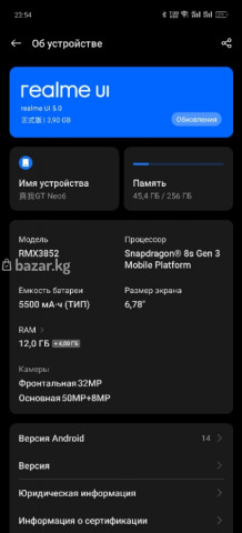 Realme GT Neo 6 КИТАЕЦ Процессор: Snapdragon 8s Gen 3, тянет все игры, не греется, едва теплый Экран: 6,78 дюймов, AMOLED, LTPO ( адаптивная частота от 1до 120Гц), пиковая яркость 6000 нит, очень яркий и сочный экран, без выгораний Память: 12 ГБ RAM и 256 ГБ встроенной Камеры: фронтальная 32 МП; основная 50 МП + 8 МП, фотографии и видео на уровне Айфона 13ПМ Аккумулятор: 5500 мА·ч, хватает на 10-12 часов экранного времени при повседневном использовании, в комплекте чехол, зарядник на 120Вт, с 0 до 100 заряжается за 30-40 минут (не оригинальный), заклеен в пленку в круг, стекла на камерах, есть пару царапин и коцек на корпусе, под плёнкой экран чистый, практически без царапин, 2 сим-карты, IMEI зарегистрированы, пользуюсь почти год Обмен не интересует, торг минимальный