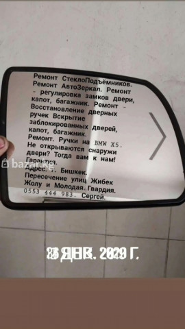 Ремонт авто зеркал, ремонт стекло подъёмников. ремонт дверных ручек. Ремонт Авто зеркал, Любые полоски. разбилось зеркало, заменю. перестало складываться, сломались механизмы регулировки, складывания зеркал. любые полоски. оторвалось или сломалось крепление, раздолталось, весит на проводах. любые работы, любые авто. Ремонт Стекло подъёмников, замена тросиков, ремонт спуск, подъём стёкол. любые авто. Ремонт Дверных ручек. оторвали или сломали дверную ручку ,не открываются двери с нутри или с наружи. Ремонт СтеклоПодъёмников. Ремонт АвтоЗеркал. Ремонт - регулировка замков двери, капот, багажник. Ремонт дверных ручек Вскрытие заблокированных дверей, капот, багажник. Ремонт. Ручки на BMW X5. Не открываются снаружи двери? Тогда вам к нам! Гарантия. Адрес. г. Бишкек. ул. Ат башинская. 2/1. район, Пересечение улиц Жибек Жолу и Молодая Гвардия. . . Сергей. Граффити "Счастливая девушка" Ат башинская, 2/1, Бишкек..