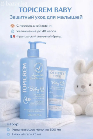 Topicrem Baby набор защитное увлажняющее молочко 500 мл + В ПОДАРОК нежный очищающий гель 75 мл TOPICREM BABY — набор для бережного ухода за чувствительной кожей малыша с первых дней жизни. Защитное увлажняющее молочко помогает поддерживать мягкость кожи до 48 часов, снижает ощущение сухости и поддерживает естественный барьер. Нежный очищающий гель мягко очищает кожу и волосы, не пересушивая и сохраняя комфорт. Формулы высокой переносимости подходят для ежедневного применения и протестированы под дерматологическим и педиатрическим контролем. Французский аптечный стандарт ухода.