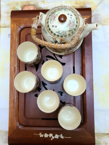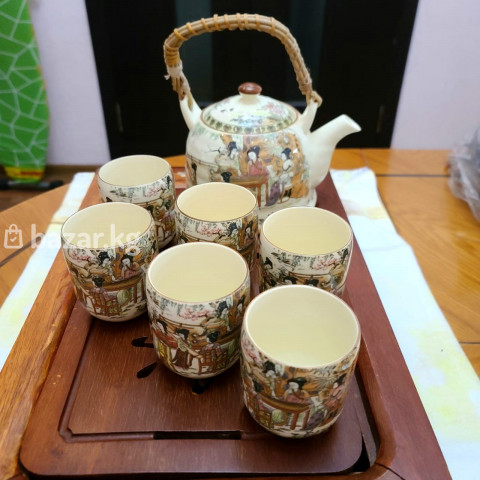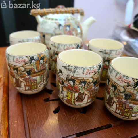 Чайный набор в восточном стиле Состав: - чайник с носиком и бамбуковой ручкой; - 6 пиал; - деревянный чайный поднос с дренажными прорезями и инкрустацией. Особенности: - керамика с многокрасочной ручной росписью в традиционных азиатских сюжетах (геиши, сады, цветущая сакура); - мягкий кремовый тон внутри чашек и чайника; - изогнутый носик для аккуратного наливания, плотная крышка с ручкой-пуговкой; - поднос из дерева, центральная решётка для стока жидкости и углубление по периметру. Подойдёт для гунфу-ча, улунов, зелёного и белого чая, сервировки чайной церемонии и декоративного оформления. Набор создаёт атмосферу классической чайной с акцентом на эстетику и медитативность процесса.