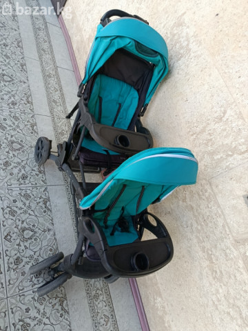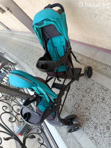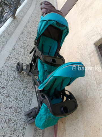 Прогулочная коляска для двойни (тандем, сидения друг за другом) - Формат: два полноценных сиденья одно за другим. - Цвет: бирюзовый с черными элементами. - Капюшоны: два раздельных, глубоких, с козырьками и вентиляционным окошком у заднего сиденья. - Сиденья: индивидуальные спинки и 5‑точечные ремни безопасности в каждом месте. - Бамперы-столики: два отдельные съёмные передние столика с подстаканниками. - Родительская панель: органайзер у ручки с двумя подстаканниками и отделением. - Рама: прочная, компактная база; передние колёса сдвоенные поворотные, задние – крупнее для лучшей проходимости. - Тормоз: ножной на задней оси. - Подножки для обоих детей. - Корзина для покупок под сиденьями. - Механизм сложения: складная рама для хранения и перевозки. Идеальный вариант для близнецов или детей-погодок: узкая база легче проходит в дверные проёмы и лифты, каждый ребёнок имеет своё место и регулировки