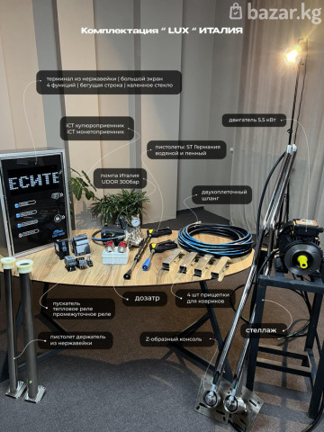 Представляем вам комплектацию "LUX" ИТАЛИЯ 🇮🇹. Она представляет собой набор оборудование для автомойки самообслуживания. В комплектацию входит: 1) Терминал из нержавеющей стали с большим экраном, 4 функциями, бегущей строкой и закаленным стеклом. 2)Для приема платежей предусмотрены купюроприемник и монетоприемник ICT. 3)Система оснащена помпой UDOR 300 bar производства Италии 🇮🇹 и двигателем мощностью 5.5 кВт. 4)Пистолеты ST Германия 🇩🇪 для подачи воды и пены, а также шланг. 5)Для управления используются пускатель, тепловое и промежуточное реле. 6)В набор также входят дозатор, 4 прищепки для ковриков, пистолет-держатель из нержавеющей стали, Z-образная консоль и стеллаж. 📍Адрес: Аламединский базар, Семена Буденного 138/1, Торговый дом Актан (Напротив ТЦ Табылга) Первый этаж, офис D6 бутик, EASY WASH 📞Звоните или пишите в WhatsApp УСПЕЙТЕ ЗАКАЗАТЬ! Возможна доставка по регионам.