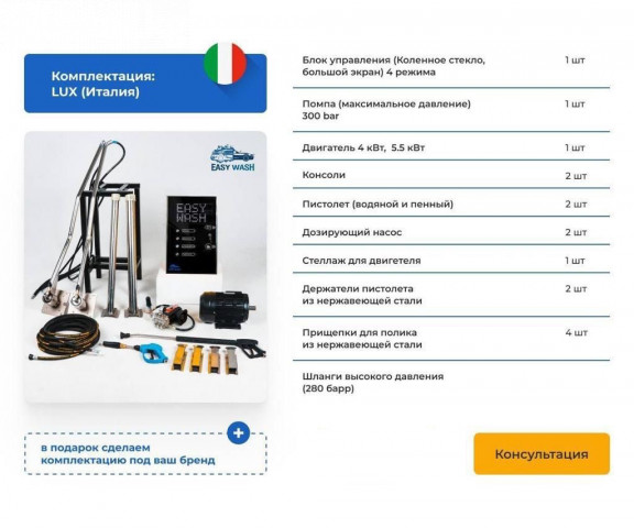 Комплектация оборудования для автомойки самообслуживания LUX Италия