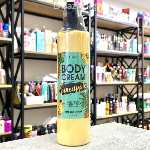 Крем для тела "Ананас" с ароматом сладкого ананаса Aqua Complex активная увлажняющая формула: Betaine и производное мочевины обеспечивают эффективное увлажнение, поддерживают гидролипидный баланс, препятствуют потере влаги. Сoconut oil смягчает кожу, оставляя её гладкой и эластичной. Argan oil источник омега-9, линолевой кислоты и витамина Е. Легко наносится, быстро впитывается.