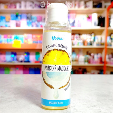 Масло для массажа Yovee «Райский массаж», с ароматом кокоса и ананаса, 50 мл. Натуральные масла в составе сделают массаж не только насыщенным и чувственным, но и полезным для вашей кожи. Отлично скользит и смывается водой. Пикантный и тропический аромат кокоса и ананаса с лёгкостью расслабит и подготовит вас к чувственному массажу. Идея для свидания: Подготовьте фрукты и коктейли и наденьте летний наряд. Предложите партнёру райский массаж. Сделайте массаж своим обнажённым телом — так он станет ещё более интимным и чувственным. Такое свидание останется в памяти надолго!