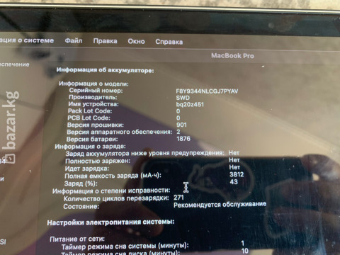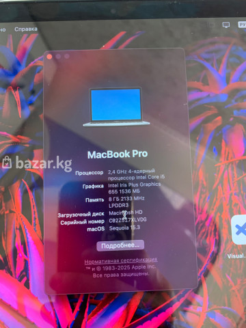 MacBook Pro 272 цикл 3750 мА:ч В комплекте заратка, стекло,обложка чехол двух сторон. Характеристики из системы: - Процессор: 2,4 ГГц, 6-ядерный Intel Core i5 - Графика: Intel Iris Plus Graphics 655, 1536 МБ - Оперативная память: 8 ГБ LPDDR3, 2133 МГц - Загрузочный диск: Macintosh HD - Серийный номер: C02Z… (на скриншоте) - Операционная система: macOS Sequoia 15.3 Особенности: - Подходит для повседневной работы, учебы, офисных задач, веб‑разработки и мультимедиа. - Встроенная графика Iris Plus 655 обеспечивает плавную работу интерфейса и лёгкий монтаж/обработку фото. - 8 ГБ быстрой памяти LPDDR3 2133 МГц для многозадачности. - Совместим с актуальной macOS Sequoia 15.3 и экосистемой Apple.