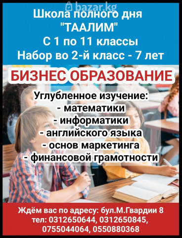 Добро пожаловать в школу полного дня Таалим! С 1 по 11 классы. Набор во 2-й класс - 7 лет Бизнес образование Углубленное изучение: - математики - информатики - английского языка - основ маркетинга - финансовой грамотности Ждём вас по адресу: бул.М.Гвардии 8 тел: 0312650644, 0312650845, 0755044064, 0550880368