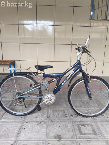 Lespo tycoon DX Характеристики: - Рама: стальная, двухподвес (пружинный задний амортизатор) - Вилка: передняя амортизационная - Колеса: 26" - Трансмиссия: многоскоростная, задний переключатель с трещоткой, передние 3 звезды (система 3x) - Тормоза: ободные V-brake спереди и сзади - Руль: прямой, вынос с регулировкой, установлены грипсы и звонок - Крыло переднее - Багажник над задним колесом - Педали платформы - Покрышки внедорожного типа Подходит для езды по городу и легкому бездорожью. Цвет: темно-синий с желтыми и белыми элементами. Модель с комфортной посадкой и широким диапазоном передач для подъемов и ровных участков.