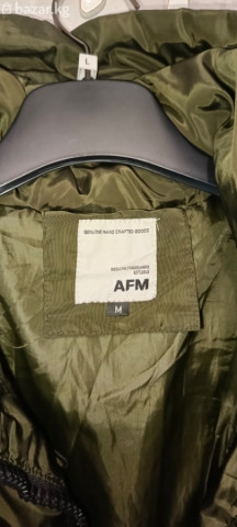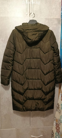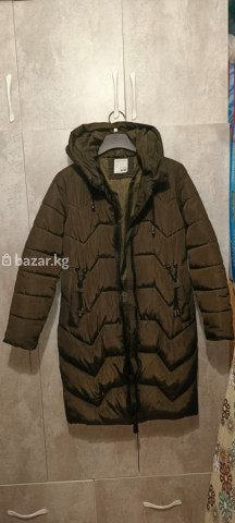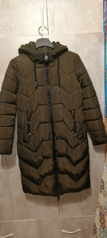 женская куртка, зимняя, размер М, 46, состояние хорошее, длина ниже колен, с капюшоном, цвет хаки.