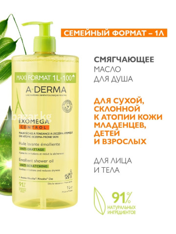 Смягчающее очищающее масло A-Derma Exomega l А-Дерма Экзомега дополняет линейку средств для ухода за очень сухой и атопичной кожей лица и тела. Оно надолго увлажняет, успокаивает, снимает зуд и подходит для любого возраста. Основу масла составляет экстракт ростов овса Реальба: он зарекомендовал себя как эффективное средство для снятия раздражения. Активные компоненты: комплекс Flaxerine (филлагрин, жирные к-ты Омега-6) помогает коже удерживать влагу, делает ее гладкой и мягкой, восстанавливает липидную пленку; экстракт ростков овса Реальба интенсивно увлажняет, смягчает, успокаивает эпидермис, способствует заживлению микроповреждений; лимонная к-та нейтрализует щелочи в воде, отшелушивает отмершие клетки, выравнивает тон кожи и восстанавливает ее сияние; глицерин защищает, смягчает, увлажняет кожу. Гипоаллергенно Применение Нанесите масло ADERMA на кожу во время принятия душа, тщательно смойте, промокните полотенцем. Можно использовать во время принятия ванны.