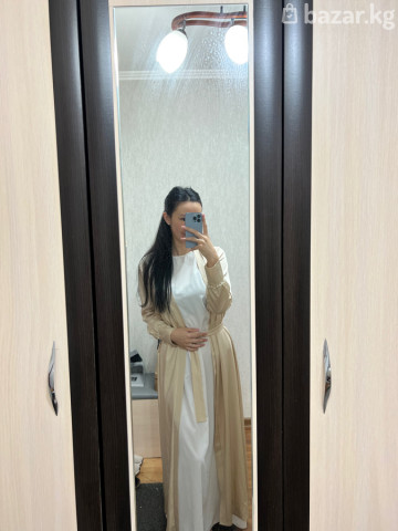Двойка абайка-платье - Длинное белое платье прямого кроя - Легкий бежевый накидной халат‑кардиган макси, завязывается поясом на талии. - Нейтральная палитра «молочный + беж», легко комбинируется с аксессуарами. - Свободная посадка, скромный силуэт, удобство в движении. - Подходит для повседневных образов, офиса, мероприятий и торжеств. - Материал визуально напоминает мягкую, струящуюся ткань с легким сатиновым отливом у накидки. В комплекте: белое платье и бежевый кардиган с поясом.