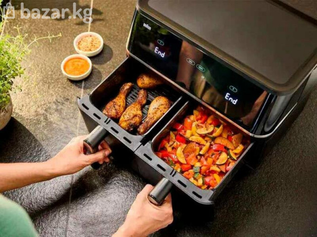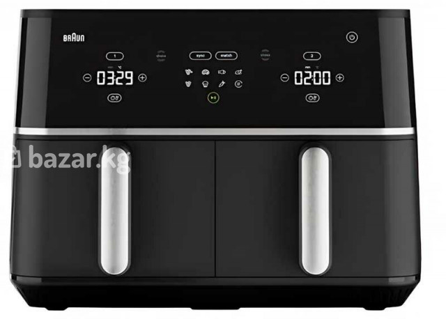 Braun TD5030IBK — аэрогриль (air fryer) немецкого производства с комбинированным пластиково‑металлическим корпусом, ёмкостью 10 л и мощностью 2400 Вт. Основные характеристики Мощность: 2400 Вт. Объём: 10 л. Тип нагревателя: ТЭН (трубчатый электронагреватель). Максимальная температура нагрева: 200 °C. Управление: сенсорное, с дисплеем; управления со смартфона — нет. Автоматических программ: 8. Системы защиты: защита от перегрева. Материал корпуса: пластик + металл. Размеры: 400 × 450 × 300 мм. Вес: 7000 г (7 кг). Цвет: чёрный.