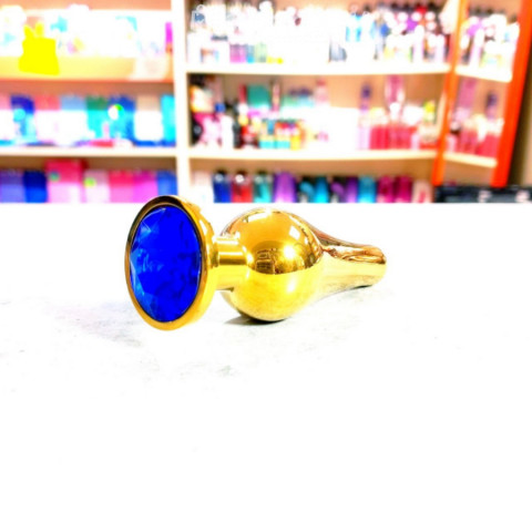 Золотистая анальная пробка с синим кристаллом Изысканность и сияние Этот аксессуар создан для тех, кто ценит эстетическое удовольствие не меньше физического. Благородный блеск золотого покрытия в сочетании с глубоким синим цветом кристалла превращает игрушку в настоящее ювелирное украшение. Материал: Гладкий металл, который быстро принимает температуру тела или легко охлаждается/нагревается для температурных игр. Дизайн: Классическая каплевидная форма обеспечивает комфортное введение и надежную фиксацию.