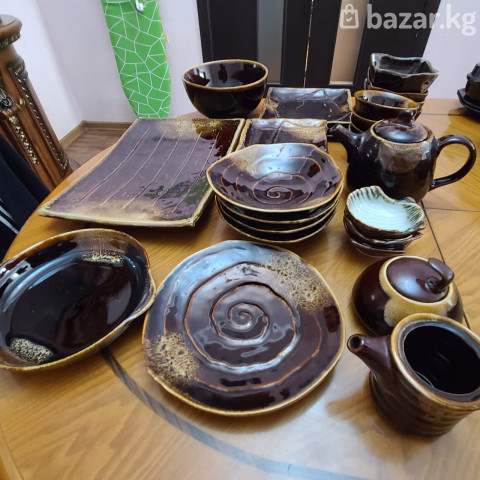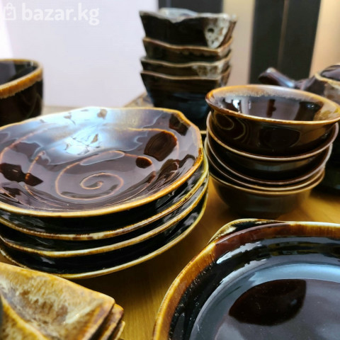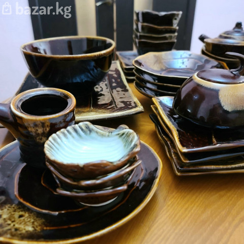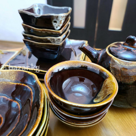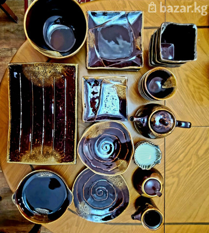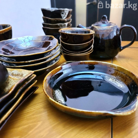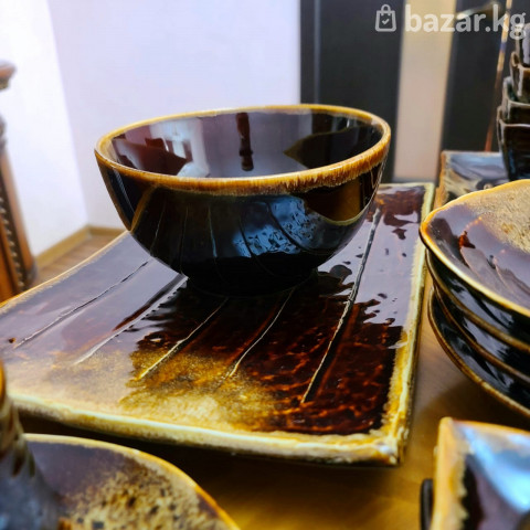 Авторский набор керамической посуды в японском стиле - Материал: керамика с толстой высокоглянцевой глазурью. - Цвет и декор: глубокий шоколадный с переходами к янтарно‑песочному; эффект ручной заливки, фактурные кромки, асимметричная форма. - Назначение: подача суши и сашими, лапши, салатов, горячих блюд - Особенности: - ручная работа, каждая единица с индивидуальной формой и рисунком глазури; - утолщённые края, комфортная посадка в руки; - сочетание квадратных и круглых форм для эффектной сервировки. - Уход и совместимость: подходит для ежедневного использования; глазурь устойчива к пятнам и легко моется. Идеален для тематической сервировки, домашнего чаепития и