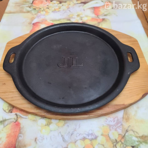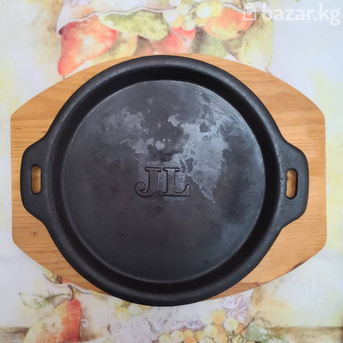 Чугунная сковорода-гриль/сервировочное блюдо JL с деревянной подставкой. Особенности: - Материал: массивный чугун — равномерный прогрев, долго держит тепло. - Форма: круглая, с бортиком по периметру (удобно для соков и соусов). - Две широкие ручки с прорезями для безопасного переноса. - Клеймо JL в центре. - Идёт в комплекте с толстой деревянной подставкой для подачи на стол. - Подходит для плиты, духовки, гриля; можно использовать для стейков, овощей, рыбы, закусок и запекания. - Инертная поверхность — естественное антипригарное свойство при правильной прокалке и уходе. Уход: - Прокаливать с маслом перед первым использованием. - Мыть без агрессивных средств, тщательно высушивать и слегка смазывать маслом. - Деревянную подставку не замачивать.