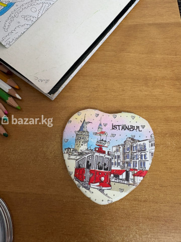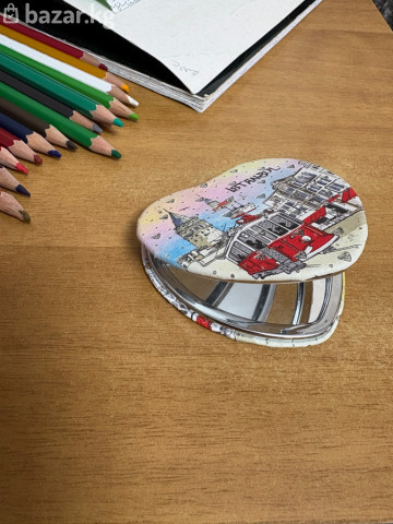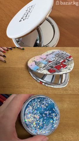 Компактные зеркальца с раскладным корпусом и фиксатором. - Два дизайна: 1) Сердечко с рисунком «Istanbul» — Галатская башня и красный трамвай. 2) Круглое с прозрачной крышкой, внутри подвижные блёстки и звездочки синего и серебристого оттенков (эффект «снежного шара»). - Корпус металлический/пластиковый, глянцевая отделка. - Внутри по два зеркальных элемента ( один увеличивает, один стандартный) - Удобный размер для сумки, косметички или кармана. - Подходит для макияжа, корректировки причёски и как милый сувенир или подарок.