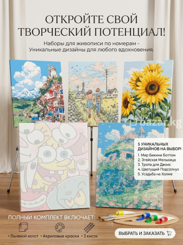 Картины по номерам — идеальное хобби, антистресс и подарок! Наборы для живописи с 5 сюжетами на выбор: 1) Мир Бикини Ботом 500сом 2) Эгейская Мельница 500сом 3) Тропа для Двоих 400сом 4) Цветущий Подсолнечник 400сом 5) Усадьба на Холме 500 сом Что внутри полного набора: - Натянутый на подрамник льняной холст с пронумерованными областями - Акриловые краски по номерам в нужной палитре - 3 кисти разной толщины Особенности: - Четкая разметка — удобно для новичков и увлекательно для опытных - Готовая картина получается яркой и детализированной - Холст можно сразу повесить на стену - Подходит для спокойных вечеров, развития усидчивости и творческого вдохновения Выберите любой из 5 уникальных дизайнов и создайте свою картину шаг за шагом!