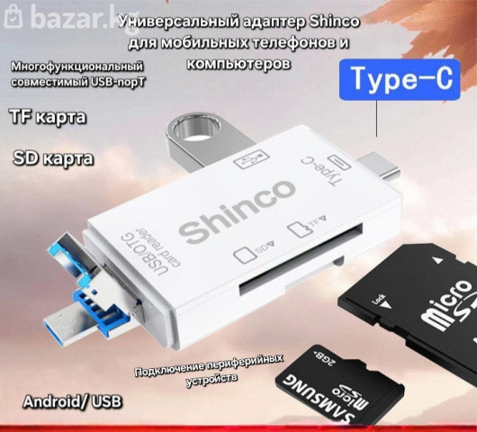 Многофункциональный кард‑ридер/OTG‑адаптер Синко 9 - Универсален для мобильных телефонов и компьютеров. - Поддержка Android/USB и разъёма Type‑C. - Разъёмы: USB, microUSB (OTG), Type‑C. - Слоты для карт: TF (microSD) и SD. - Совместимость с подключаемыми USB‑устройствами и флеш‑накопителями. - Позволяет скачивать музыку напрямую с телефона на карту памяти и передавать файлы между картами, телефоном и ПК.