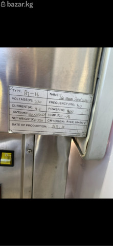 Витрина морозильная для мороженого (ice cream showcase) - Модель: B7-16 (по шильдику) - Тип питания: 220 В, 50 Гц - Потребляемая мощность: 800 Вт - Ток: 4,5 А - Диапазон температуры: до −18 °C - Хладагент: R134a / R404a - Габариты (см): 160 × 103 × 123 - Масса нетто: 258 кг - Год выпуска: 2011-10 Особенности: - Панорамное изогнутое стекло для максимальной обзорности витрины. - Раздвижные стеклянные створки у продавца. - Электронный контроллер температуры и цифровой дисплей. - Панель управления с отдельными клавишами: включение, освещение/охлаждение и др. - Корпус из нержавеющей стали, нижняя решётка-конденсорная зона. - Подходит для выкладки и продажи шарикового мороженого, сорбетов и замороженных десертов в кафе, магазинах и на фуд-точках