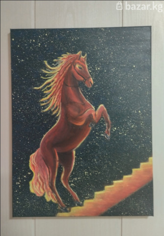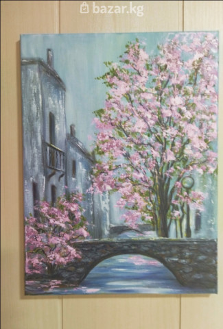 Конь в ночном небе,40/30, цветение сакуры у каменного моста40/30.п.холст,ма