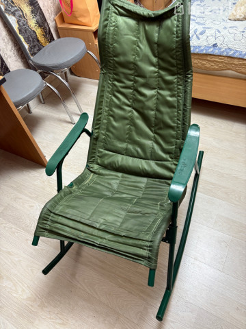 Кресло-качалка - Тип: складное кресло-качалка с высокой спинкой и подголовником - Каркас: металлический, дугообразные полозья для мягкого покачивания - Материал сиденья/спинки: плотная стеганая ткань с наполнителем - Цвет: тёмно‑зелёный (каркас и ткань в едином тоне) - Подлокотники: пластиковые, эргономичной формы - Конструкция: поясная часть усилена дополнительными стежками; крепление чехла на трубе каркаса - Подходит для дома, балкона/лоджии, дачи, террасы - Комфортная посадка с поддержкой шеи и спины - Легко перемещается, компактно становится у стены Отличный вариант для отдыха, чтения и расслабляющего времяпрепровождения