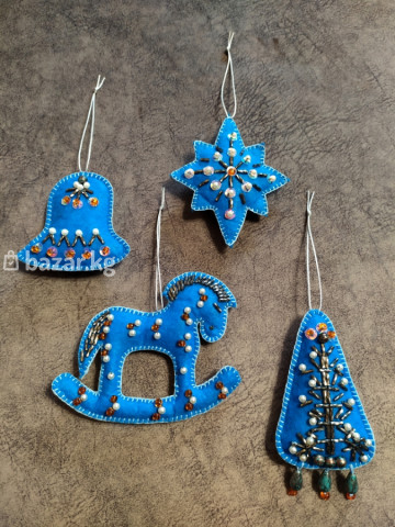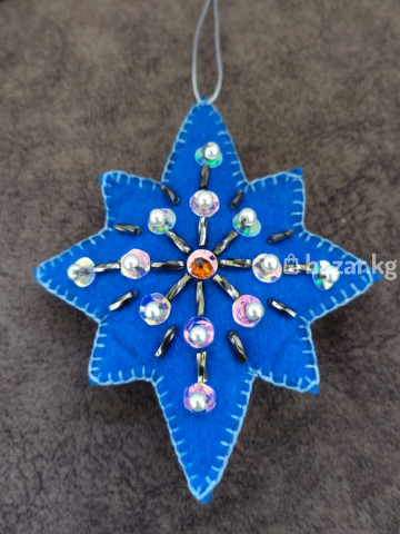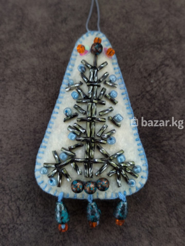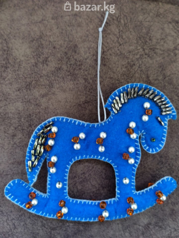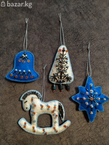 Продается набор ёлочных игрушек ручной работы. В наборе 4 игрушки. Сшиты игрушки из фетра. Мягкие. Внутри синтепух. Игрушки двусторонние. Вышивка выполнена бусинами, бисером и пайетками. Колокольчик и звёздочка - голубые. Ёлочка и лошадка с одной стороны голубые, с другой белые. В наборе присутствует символ наступающего года - Года Лошади. Игрушки упакованы в белую коробочку. Внутри есть маленькая открытка, на которой вы сможете написать свои пожелания. Набор может стать прекрасным эксклюзивным подарком на праздник. В наличии только один набор!