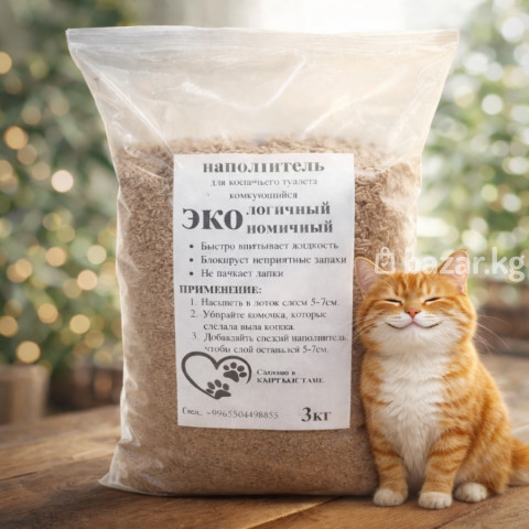 ЭКО наполнитель для кошачьего туалета, комкующийся. Упаковки по 3 и 6 кг. Комкующийся Комкующийся с активированным углем. доставка по городу Особенности: - Быстро впитывает жидкость. - Блокирует неприятные запахи. - Не пачкает лапки. Состав/форма: гранулы мелкой фракции. Инструкция по применению: 1) Насыпьте в лоток слоем 5–7 см. 2) Регулярно удаляйте образовавшиеся комочки. 3) По мере расхода досыпайте свежий наполнитель, поддерживая слой 5–7 см. Наш товар Вы можете найти в зоомагазинах по адресам: Безымянная 4/2 (р-к Ортосай) КОТОПЁС; Кулиева 1/3 (птичий рынок) ЗЕЛЁНЫЙ МИР; Московская 78/1 ТК АК Эмир МЯУ; Аламедин 1 ZOOсфера; с.Манас ул.Средняя 22 АГРОВЕТАПТЕКА . Произведено в Кыргызстане.