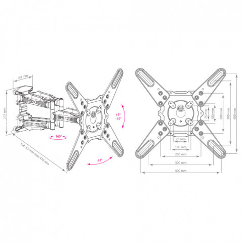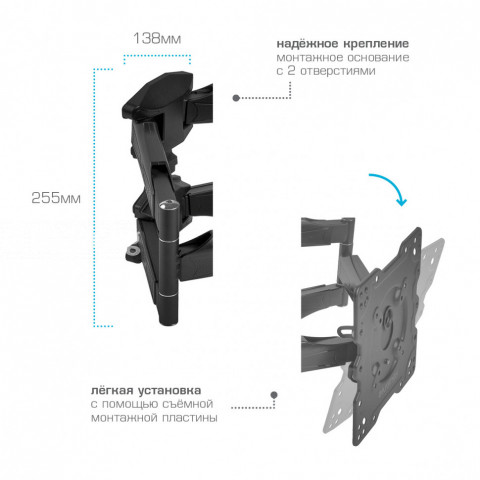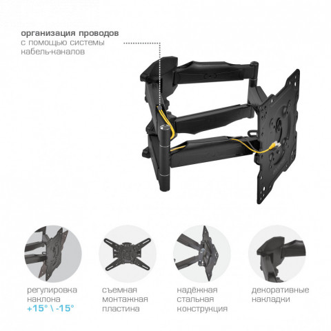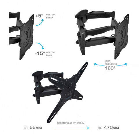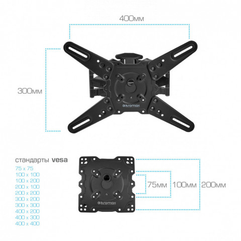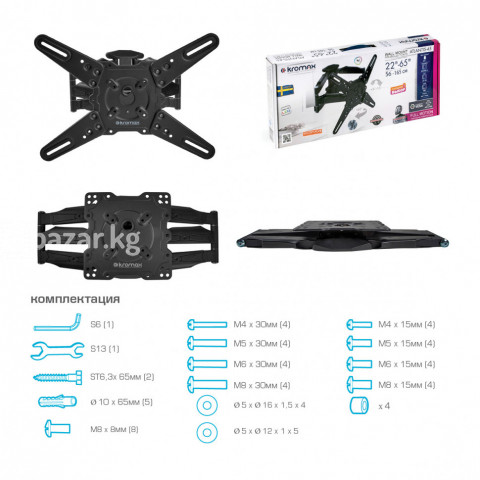 Настенный поворотно-наклонный кронштейн для телевизоров и мониторов с диагональю от 22 до 65 дюймов. Настенный двухколенный наклонно-поворотный кронштейн Kromax Atlantis-45 предназначен для средних и больших телевизоров и плазменных панелей с диагональю от 22 до 65 дюймов. Усиленная двуручная конструкция имеет широкий диапазон регулировки положения и перемещения телевизора, исключительную плавность движений, а два параллельных колена исключают перекос экрана в любом положении. Сохраняя все преимущества и функциональность шарнирных кронштейнов, кронштейн Kromax Atlantis-45 отличается особой прочностью и надёжностью, изящным дизайном, исключительной маневренностью и новой быстрой системой сборки. Широкие возможности по повороту, наклону, перемещению в различных направлениях, а также изменение угла наклона экрана дают возможность устранить блики и обеспечить максимальный комфорт и удобство при просмотре с любой точки. Регулировка наклона осуществляется лёгким прикосновением. Специальные пластиковые накладки скрывают место крепления к стене и придают кронштейну эстетически законченный и элегантный внешний вид. Система шарниров позволяет регулировать положение экрана телевизора, оптимизируя пространство помещения и добиваясь наиболее удобного расположения экрана для просмотра. В комплекте поставки крепления есть вся необходимая фурнитура для монтажа. Кронштейн KROMAX Atlantis-45 имеет пожизненную гарантию. В набор входят полный комплект крепежей для ТВ и крепления к стене, а так же полноценная инструкция по установке и сборки на русском языке. Поддерживаемые стандарты VESA: 75 x 75 100 x 100 100 x 200 200 x 100 200 x 200 300 x 200 300 x 300 400 x 200 400 x 300 400 x 400