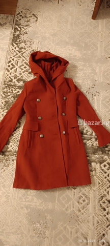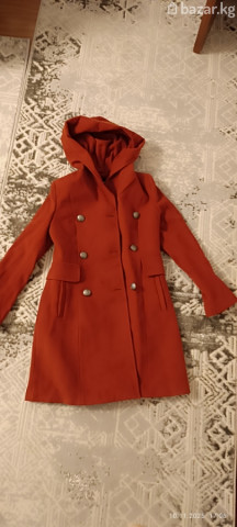Женское пальто-парка с капюшоном, кирпично-оранжевый цвет. Особенности: - Двубортный фасон с декоративными металлическими пуговицами (по две вертикальные линии + нижние пуговицы). - Объемный капюшон для защиты от ветра. - Приталенный силуэт, длина до середины бедра. - Вертикальные прорезные карманы по бокам. - Декоративные клапаны на линии талии. - Плотная верхняя ткань, подкладка внутри. - Аккуратные вытачки и швы, удерживающие форму. Подойдет для осенне-весеннего сезона, сочетается с повседневными и городскими образами. Цвет делает образ ярким, а двубортная линия и пуговицы добавляют классики. Размер ориентировочно S–M (визуально приталено).