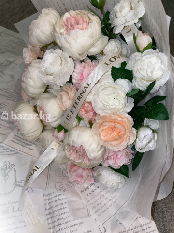 Роскошный букет пионов (искусственные) Идеален для подарка, фотосессии или интерьера. Нежные оттенки белого, розового и персикового. Лента с надписью "Love is eternal" — изысканный акцент. Цветы выглядят как живые, не требуют ухода. Цена: [3500] Доставка/самовывоз: [Бишкек ]