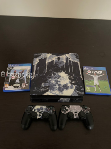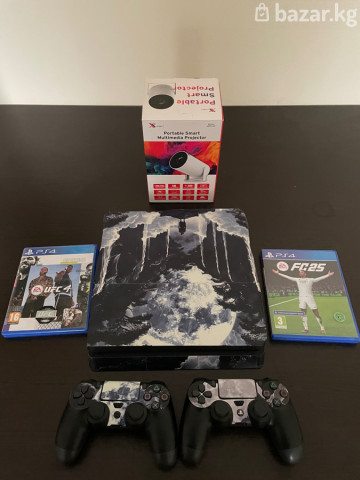 Игровой комплект PlayStation 4 Состав набора: - Консоль Sony PlayStation 4 с декоративной виниловой наклейкой (темная графика с луной/океаном). - 2 беспроводных геймпада DualShock 4 с совпадающими декоративными вставками. - Игра на диске: EA Sports UFC 4 (PS4), рейтинг PEGI 16. - Игра на диске: EA Sports FC 25 (PS4), рейтинг PEGI 3. И семь других игр как: GTA V, ASSASSINS,EFOOTBALL, CALL OF DUTY и другие - Портативный смарт‑проектор в коробке (Portable Smart Multimedia Projector) — компактный проектор для вывода изображения на большой экран; на коробке указаны функции мультимедиа/Smart. Особенности: - Поддержка локального мультиплеера благодаря двум контроллерам. - Футбол и файтинг на физических носителях — можно играть без загрузки из сети. - Проектор позволяет организовать игровой сеанс на большом экране вне зависимости от наличия телевизора. Комплект отлично подходит как для домашнего гейминга, так и для выездных игровых сессий.