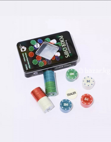 набор «Professional Poker Chips» Комплектация: - 100 двуцветных фишек • номиналы: 1€, 5€, 10€, 25€ • по 25 фишек каждого номинала • вес одной фишки – 4 г - фишка дилера (Dealer) - компактный металлический кейс Размер кейса: 19 × 12 × 5 см — удобно хранить и брать с собой. Особенности: - четкая маркировка номиналов, контрастные цвета - прочный кейс защищает фишки при переноске - подходит для домашних игр