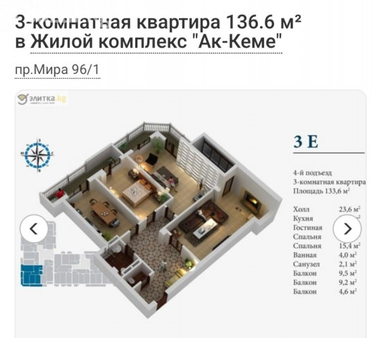 Продаю 3х- комнатную квартиру с ремонтом от СК Capstroy , ЖК Ак Кеме . Адрес - ПРОСПЕКТ Чынгыза Айтматова ДОМ 95/2 . Общая площадь квартиры 136 м2 , этаж ВТОРОЙ . Окна пластиковые выходят и восток-юг . Полы - ИТАЛЬЯНСКИЙ ПАРКЕТ , стены - ОБОИ . Комнаты изолированые , сан/узел раздельный . Дом кирпичный , все коммуникации центральные , отопление электрическое . ЦЕНА 21.875.000 сомов . Телефон 0550 31 31 31 ( пишите мне на вотсап )
