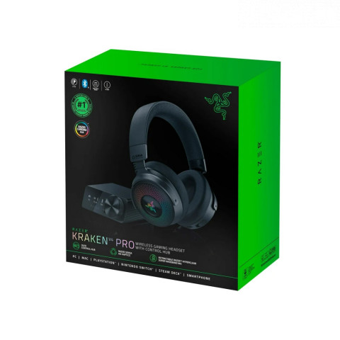 Беспроводная гарнитура Razer Kraken V4 Pro с OLED блоком управления, вибрацией Razer Sensa HD Haptics, 4 типами подключения, 9-зонной подсветкой Razer Chroma RGB, поворотными чашками наушников, выдвижным сверхширокополосным микрофоном Razer HyperClear, 40мм излучателями Razer TriForce Bio-cellulose и автономной работой до 50 часов. — Технические характеристики Особенности — OLED блок управления — Вибрация нового поколения Razer Sensa HD Haptics — Виртуальный 7.1 объемный звук THX Spatial Audio — 4 режима подключения — RGB подсветка Razer Chroma — Наушники — Тип наушников: Полноразмерные закрытые — 4 варианта подключения: Беспроводная связь Razer HyperSpeed Wireless (2,4 ГГц), Беспроводная связь Bluetooth 5.2, проводное подключение USB Type-A, проводное подключение 3.5мм (3.5 мм порт расположен на OLED блоке управления) — Одновременная работа беспроводной связи Razer HyperSpeed Wireless (2,4 ГГц) и Bluetooth — Диапазон частот: 20-28 000 Гц — Сопротивление: 32 Ом при 1 кГц — Чувствительность: 98 дБ SPL/мВт при 1 кГц (HATS) — Динамики Razer TriForce Bio-Cellulose, 40-мм с неодимовыми магнитами — Амбушюры овальные из высококачественной протеиновой искусственной кожи, наполнение пеной с эффектом памяти — Внутренний диаметр чашки наушника 62 x 45 мм — Поворотные на 90 градусов чашки наушников — Поддерживаемые кодеки Bluetooth: SBC, AAC — RGB подсветка 9-зонная Razer Chroma на чашках наушников — Звуковые профили: Game, Movie, Music, Custom (все профили эквалайзеров могут быть перенастроены через приложение Razer Synapse) — Профили вибрации Razer Sensa HD Haptics: Controlled, Balanced, Dynamic, Custom (все профили вибрации могут быть перенастроены через приложение Razer Synapse) — Уровни вибрации Razer Sensa HD Haptics: Low, Med, High, Off — Пассивное шумоподавление — Поддержка программы настройки Razer Synapse 4 (Razer Synapse 3 не поддерживается) — Виртуальный 7.1 объемный звук THX Spatial Audio, встроен в программу Razer Synapse — Разъем USB Type-C на левой чашке наушников для зарядки наушников — Кабель в защитной тканевой оплетке USB Type-A — USB Type-C, длиной 1,5 м — Кабель в защитной тканевой оплетке USB Type-C — USB Type-C, длиной 1,5 м, 60 W — Кабель в защитной тканевой оплетке, совмещенный аудио+микрофон 3.5 мм — 3.5 мм, длиной 1,25 м — Вес наушников: 390 г — Время работы от батареи — Продолжительность работы от аккумулятора до 50 часов (вибрация/подсветка выключены, подключение 2,4 ГГц) — Продолжительность работы от аккумулятора до 45 часов (вибрация/подсветка выключены, подключение 2,4 ГГц + Bluetooth) — Продолжительность работы от аккумулятора до 13 часов (вибрация/подсветка включены, подключение 2,4 ГГц) — Зарядка полностью разряженного аккумулятора длится приблизительно 4 часа — Зарядка на 15 минут даст около 5 часов игрового времени — Микрофон — Тип микрофона: Выдвижной сверхширокополосный микрофон Razer HyperClear — Полностью убирается в чашку наушников, гибкий — Диаграмма направленности: однонаправленный — Диапазон частот: 100-10 000 Гц — Чувствительность (при 1 кГц): –42 ± 3 дБ — Отношение сигнал-шум: ≥ 60 дБ — Вибромоторы — По 1 вибромотору в каждой чашке наушника — Диапазон частот: 45–300 Гц — Максимальное создаваемое ускорение: 4,3 g — Управление на чашке наушников — Кнопка питания — Светодиодный индикатор состояния питания — Колесико регулировки уровня громкости — Кнопка отключения микрофона — Светодиодный индикатор отключения микрофона (красный — микрофон выключен) — Многофункциональная кнопка Razer (Аудиоэквалайзер, Переключатель режимов, Сопряжение через Bluetooth) — Кнопка технологии Razer Sensa HD Haptics и Баланса громкости игр