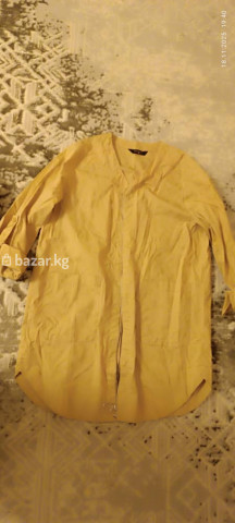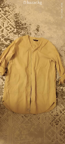 Женская рубашка-туника горчичного цвета. - Прямой свободный крой, удлиненная спинка с округлым низом - V-образный вырез горловины - Центральная молния с круглым кольцом-подвеской - Рукава 3/4 с хлястиком для фиксации подворота - Два накладных кармана спереди - Легкая хлопковая ткань (по виду) Удобная базовая модель для повседневных образов: носится как самостоятельная туника или как легкая накидка на футболку/майку. Универсальный спокойный оттенок легко сочетается с джинсами, брюками и леггинсами.