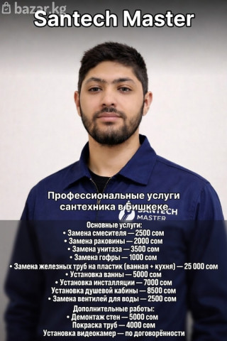 🔧 Услуги сантехника: • Замена смесителя — 2500 сом • Замена раковины — 2000 сом • Замена унитаза — 3500 сом • Замена гофры (ванна/раковина) — 1000 сом • Замена железных труб на пластик (ванная + кухня) — 25 000 сом • Установка ванны — 5000 сом • Установка инсталляции — 7000 сом • Установка душевой кабины — 8500 сом • Замена вентилей для воды — 2500 сом 🛠 Дополнительные работы: • Демонтаж стен — 5000 сом • Установка видеокамер — по договорённости. • Покраска труб — 4000 сом Tel × +996 227 100 740