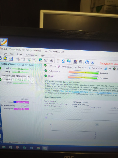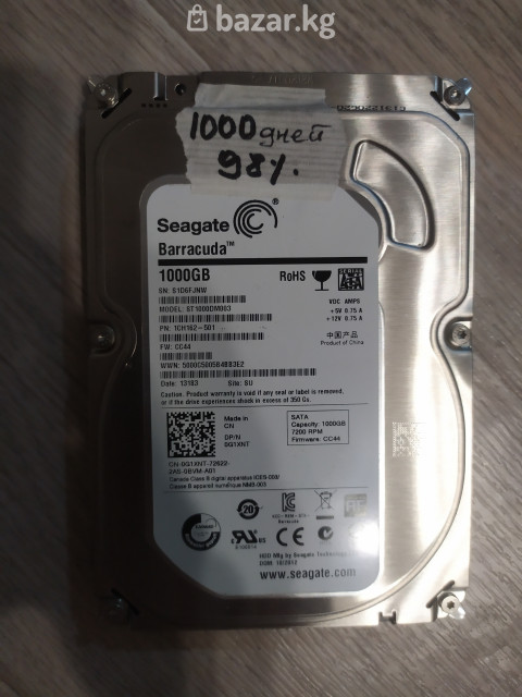 Seagate Barracuda 1Tb 1000Gb Рабочий, время работы 1000 дней, здоровье 98%.