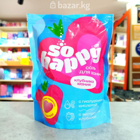 Соль для ванн "SO Happy" Клубника Мания.Соль для ванн So Happy - идеальный способ побаловать себя любовью и заботой. В каждой упаковке Вас ждёт приятный сюрприз - бомбочка-сердечко в подарок.Соль содержит гиалуроновую кислоту и экстракт клубники. Соль обладает комплексом полезных свойств: увлажняет и смягчает кожу, расслабляет, уменьшает уровень стресса и напряжения, укрепляет иммунную систему, не окрашивает кожу и ванну.