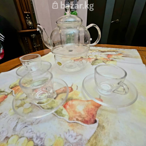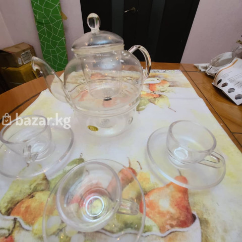 Стеклянный чайный набор на 12 персон Состав: - заварочный чайник из прозрачного стекла с крышкой и ручкой - встроенное стеклянное сито/колба для заварки внутри чайника - подставка-решотка под свечу (подогреватель) в основании чайника - 12 стеклянных чашек с блюдцами Особенности: - полностью прозрачное стекло — красиво демонстрирует заваривание чая и трав - длинный изогнутый носик для аккуратного наливания - удобная круглая ручка крышки - одинаковые чашки с эргономичными ручками и плоскими блюдцами - подходит для листового чая, травяных сборов, ягодных напитков Идеально для домашнего чаепития и сервировки стола.